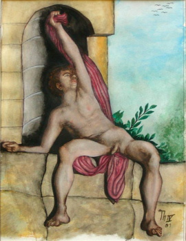 männl. Akt, sitzend Pontormo 1519-1521 Ausriss Interpretation, Juni 2001 Aquarell auf Karton 280*380 mm